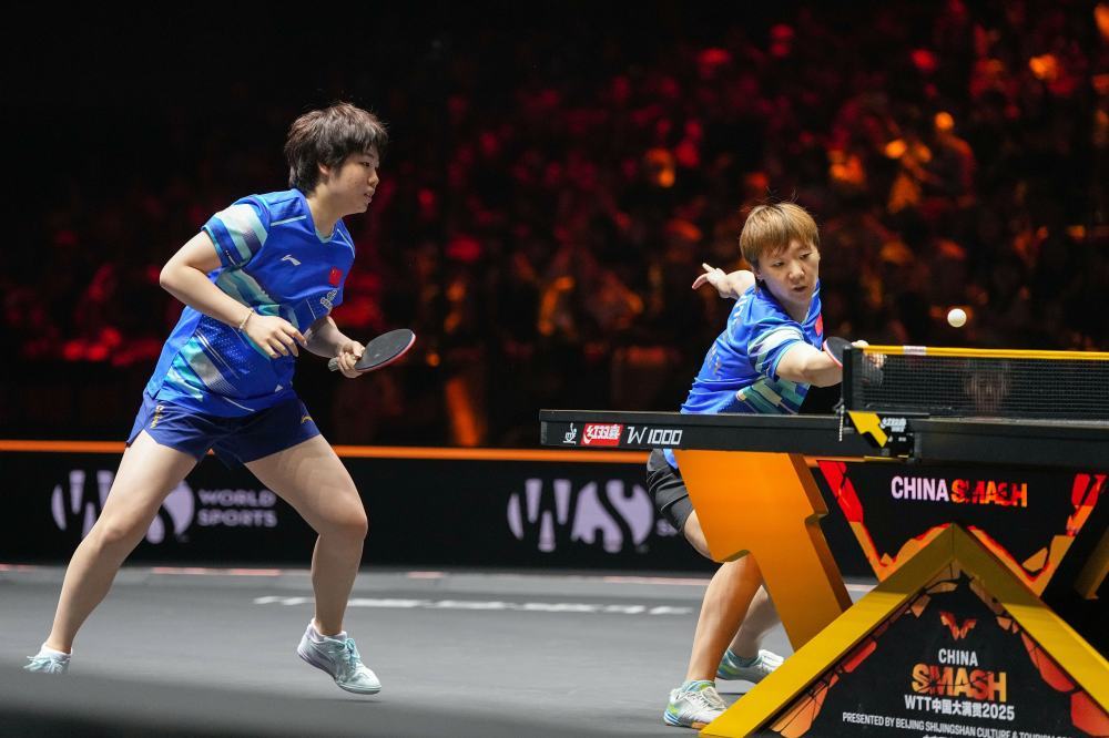 新华社,北京,10月4日。中国乒乓球王/Quaiman在2025年世界世界餐桌上的双重女性末端击败了Hayatahina(日本)/Zhu Qianxi(韩国)(WTT)中国大满贯。 Kuaiman/Wang Monyu(右)参加了这场比赛(数据照片)。照片:新华社通讯局记者Ju Huanzong的照片